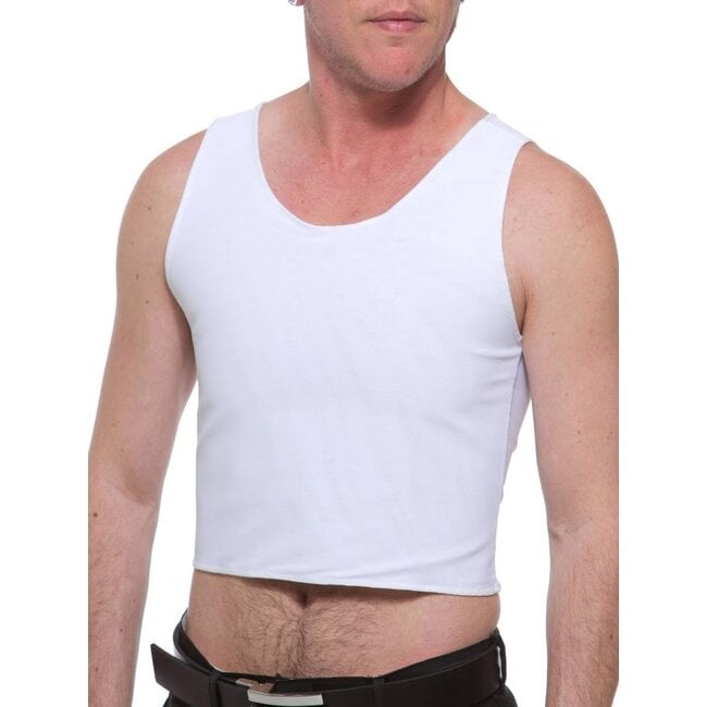 . Comfortable and soft cotton lining feels smooth against the body. High compression tank flattens the chest. Unique cut promotes freedom of arm movement. Powerful medical grade 70% Nylon and 30% spandex knit shell lined with cotton spandex blend. Reversible. Invisible side seams, no digging. High quality construction, Made in the USA