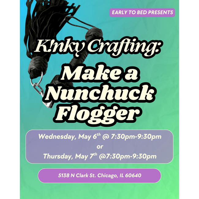 If you want to add some flourish to your impact play, then this is the crafting class for you. Nunchuck floggers are a great accessible and flexible impact toy and a great beginner leather project. Come learn basic leather working skills as we take leather scraps, dowels and metal hardware and turn them into a nunchuck flogger. This workshop is for crafting pros and amateurs alike. While leather scraps and leather working tools will be provided, you are welcome to bring your own leather and tools if you prefer.